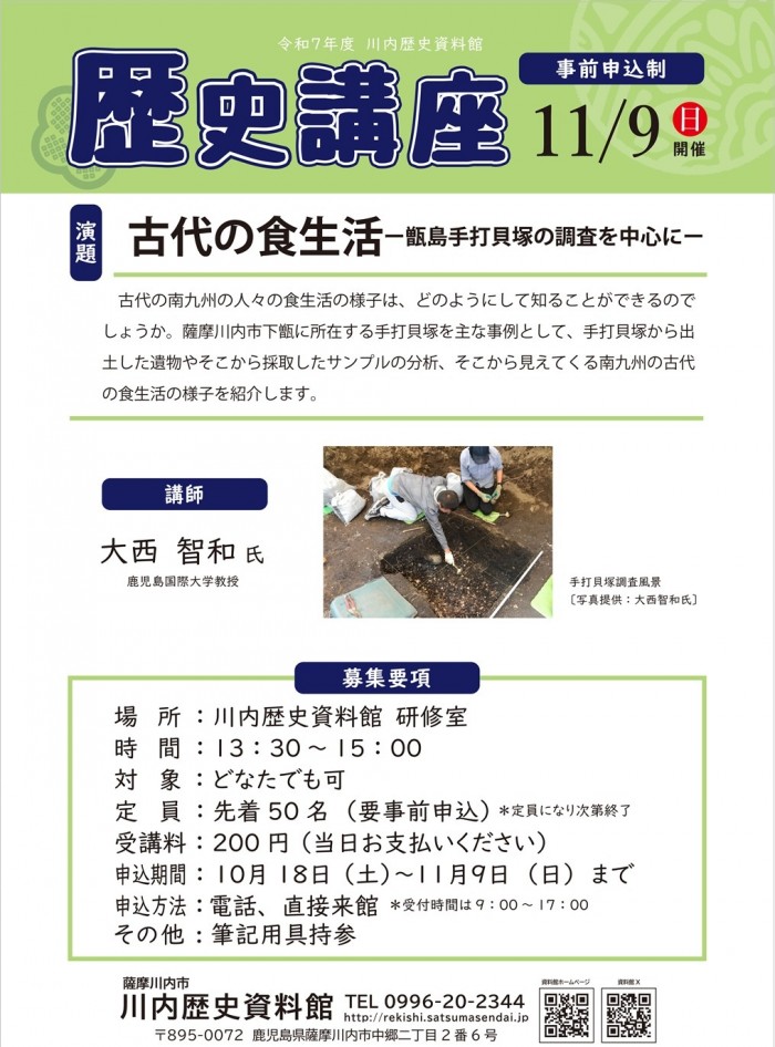 歴史講座「古代の食生活ー甑島手打貝塚の調査を中心にー」開催のお知らせ